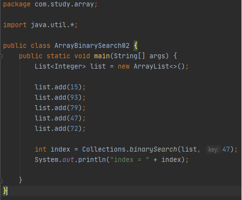 binarySearch() 메소드는 전달받은 배열에서 특정 객체의 위치를 이진 검색 알고리즘을 상요하여 검색한 후, 해당위치를 반환합니다. 이 메소드는 이진 검색 알고리즘을 사용하므로, 매개변수에 전달되는 배열이 sort() 메소드 등을 사용하여 미리 정렬되어 있어야만 제대로 동작합니다.