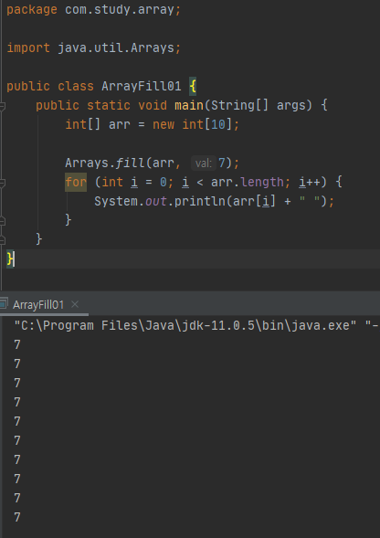 fill() 메소드는 첫 번째 매개변수로 초기화할 배열을 전달받고, 두 번째 매개변수로 초기값을 전달받습니다.